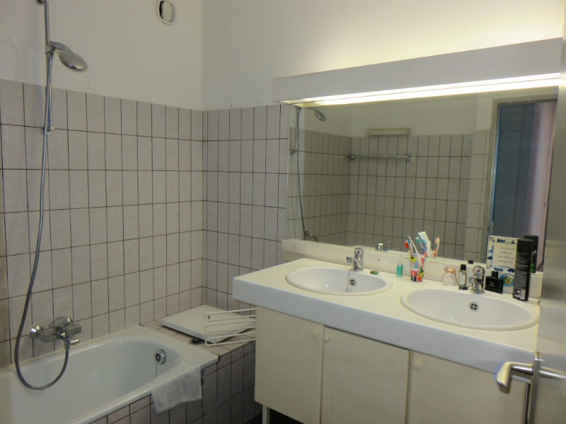 Badkamer 5,2m2 2m x 2m60: vloertegels en deels faience, ligbad en dubbele lavabo