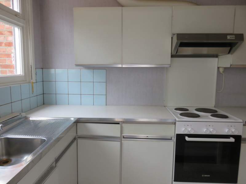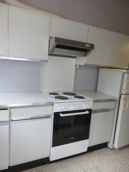Keuken 8m2 5m x 1m60: eenvoudig klassiek meubel, vloertegels, spoeltafel, dampkap - enige plaats raam met enkel glas, wel rolluiken