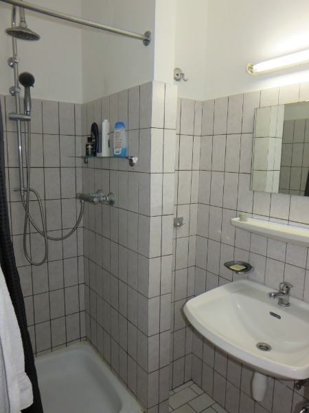 Douchekamer 2,5m2 1m60 x 1m60: vloertegels, deels faience, douche en lavabo