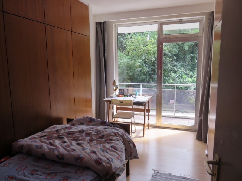 Slaapkamer 8m2 3m70 x 2m20: laminaat, ingemaakte kast en toegang naar terras